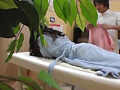 Lovely Jap Cougar fingered in voyeur massage room video