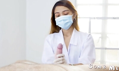 Ultra-cute and petite Japanese nurse milks off dick and sucks it on the bed